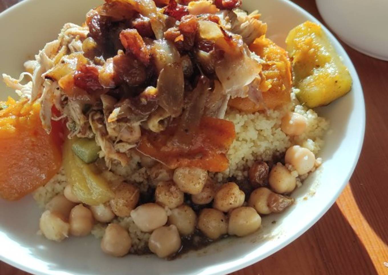 - He sacado las verduras, deshuesado el pollo y he montado el plato. Primero el cuscús luego garbanzos, verduras pollo y por encima cebolla con pasas caramelizada. Aparte el caldo especiado para ir regandolo